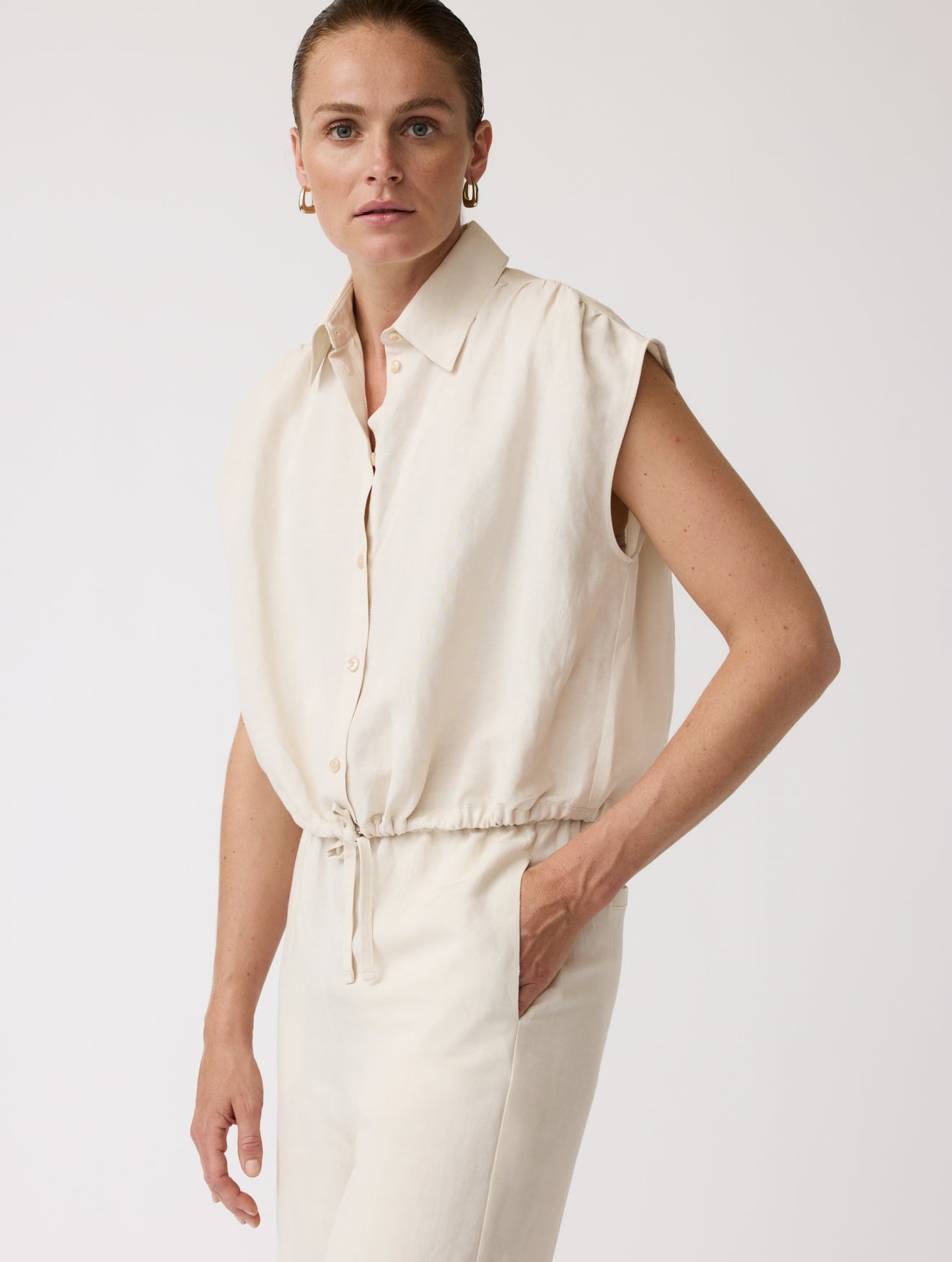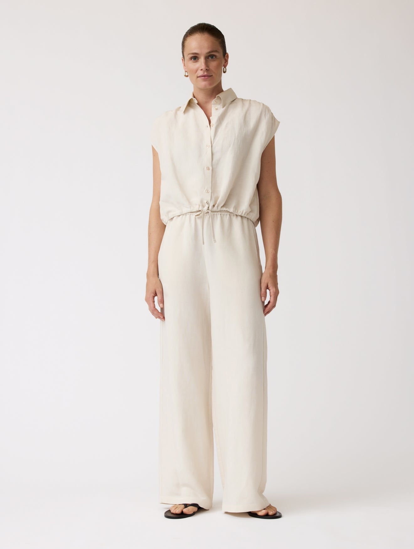 The Sammy Pants are comfortable and elegant loose-fitting trousers, made from a high-quality blend of viscose and linen. The supple and light fabric provides an airy feeling, ideal for summer days.... These pants can be beautifully combined with the Flora blouse, creating a stylish and cohesive ensemble. Together they form a summer suit that can be worn both casually and chicly. For a complete look, you can style the Sammy Pants with a blazer of the same quality, which provides a refined and fashionable look.