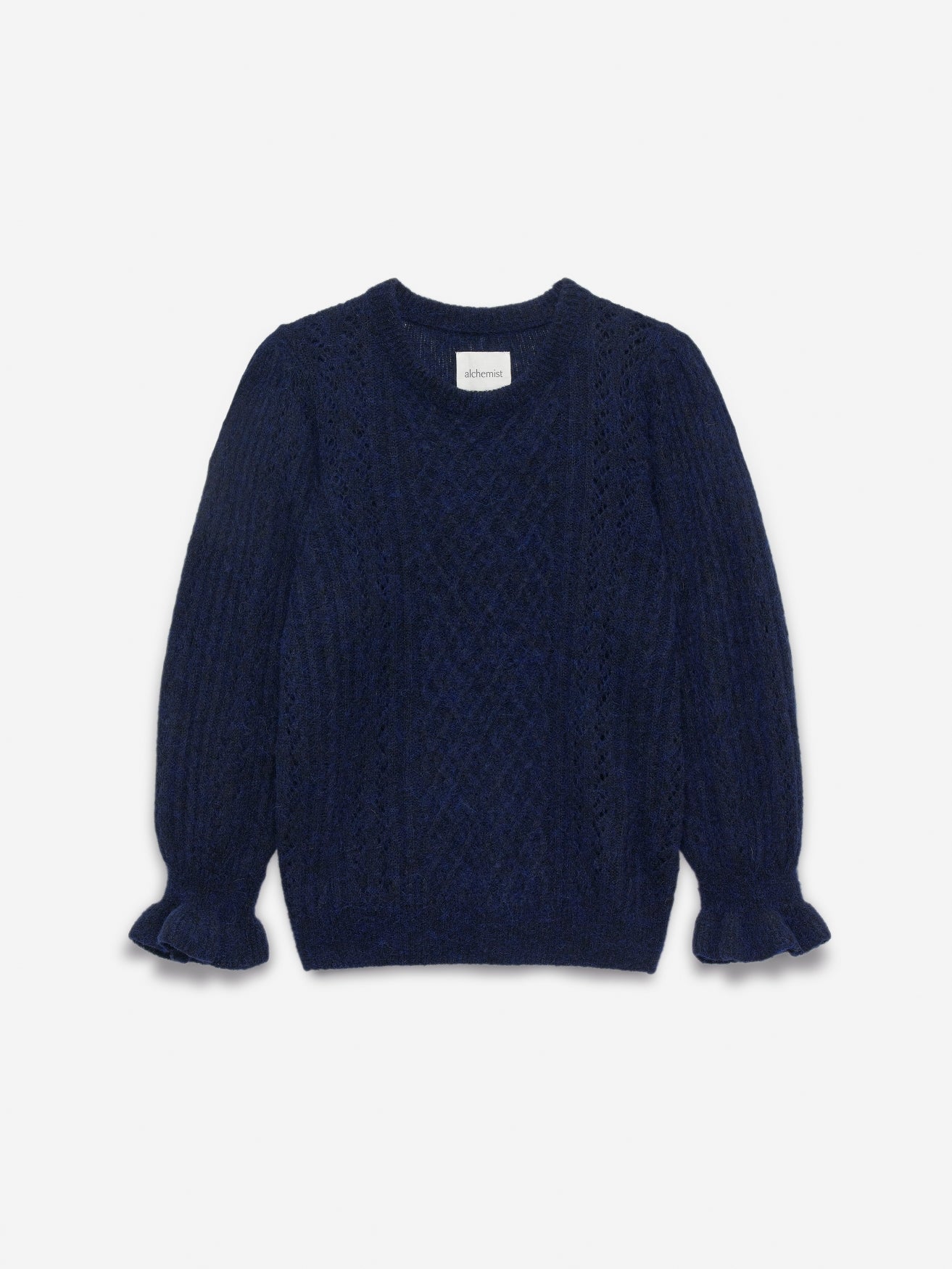 Rechtvallende ajour-knit trui met ronde hals en elegante 3/4 mouwen. De opengewerkte details geven de trui een verfijnde, vrouwelijke uitstraling.... Gemaakt van een luxueuze mix van de zachtste baby alpaca en zuivere scheerwol – warm, licht en onweerstaanbaar zacht op de huid.