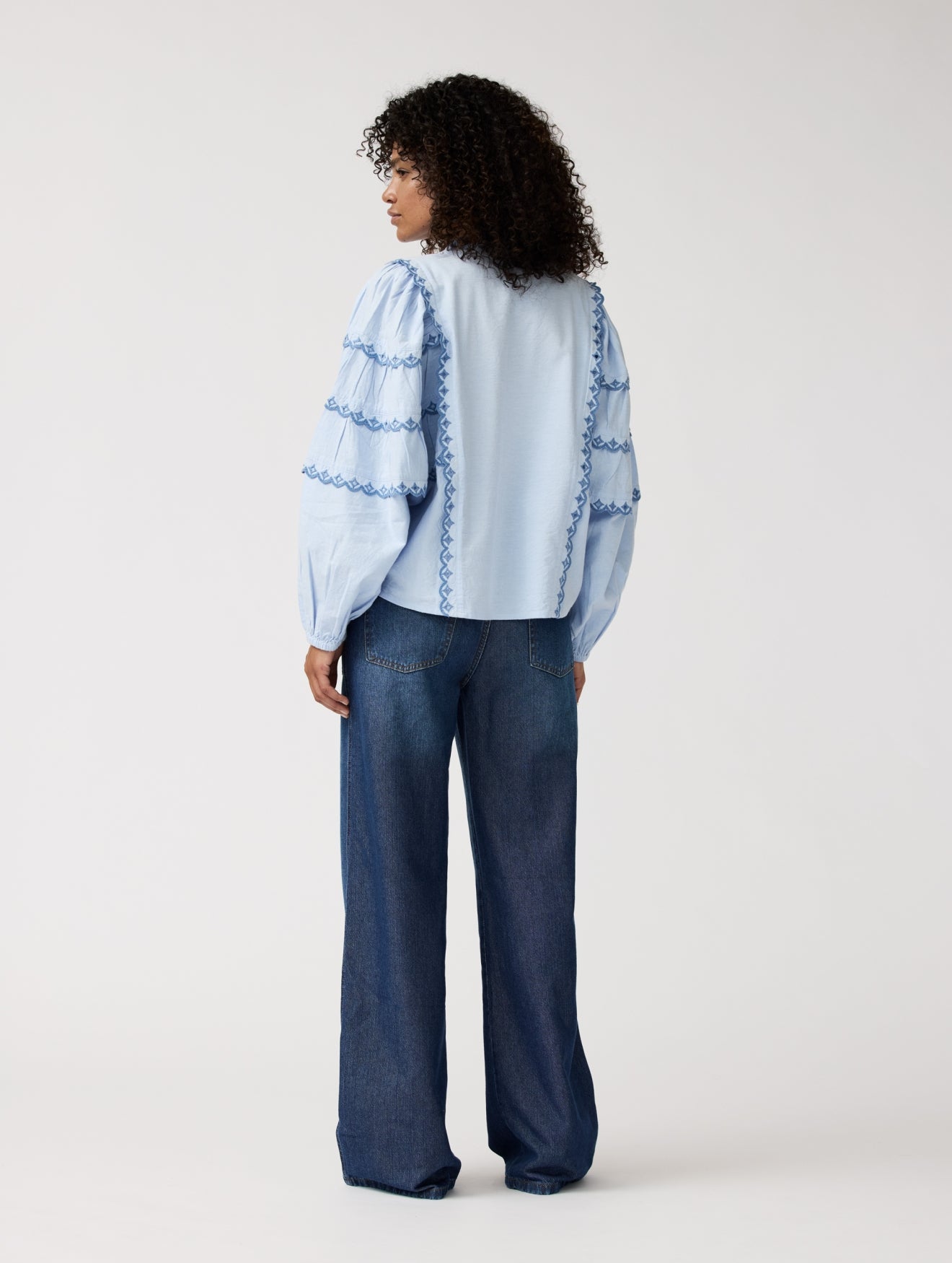 Een uitgesproken blouse van stevige katoen, met prachtige borduursels die zorgen voor een rijke uitstraling. Het doorknoopmodel heeft een ronde hals en wijd ingezette vleermuismouwen die het silhouet een eigentijdse flair geven.... De blouse valt ruim en draagt als een waar statement piece. Gemaakt van 100% katoen – natuurlijk, ademend en met karakter.