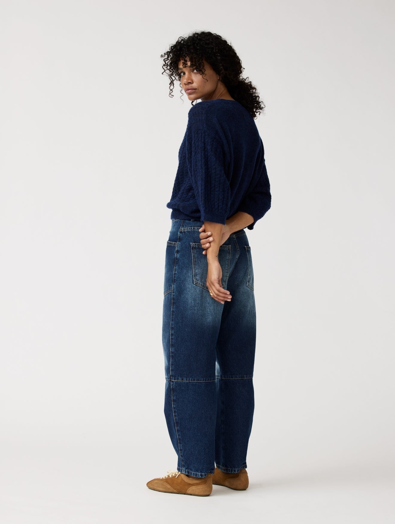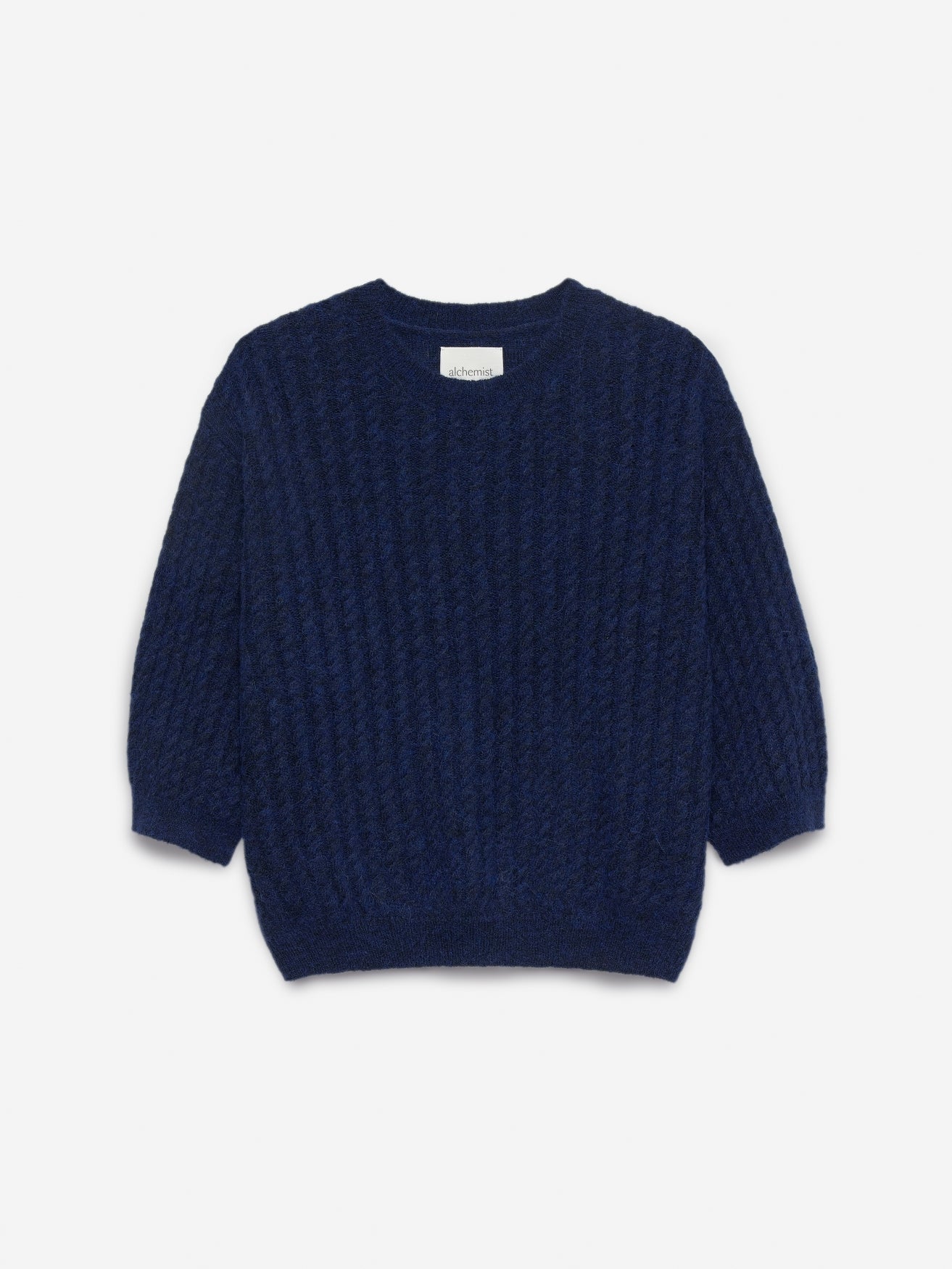 Boxy kabeltrui met halflange mouw en een ronde halslijn, gebreid in een zachte, volumineuze structuur. Het korte, rechte model geeft deze knit een eigentijdse uitstraling, terwijl de rijke mix van baby alpaca en zuivere scheerwol zorgt voor warmte en zachtheid.... Een modern en comfortabel item met een klassieke twist.