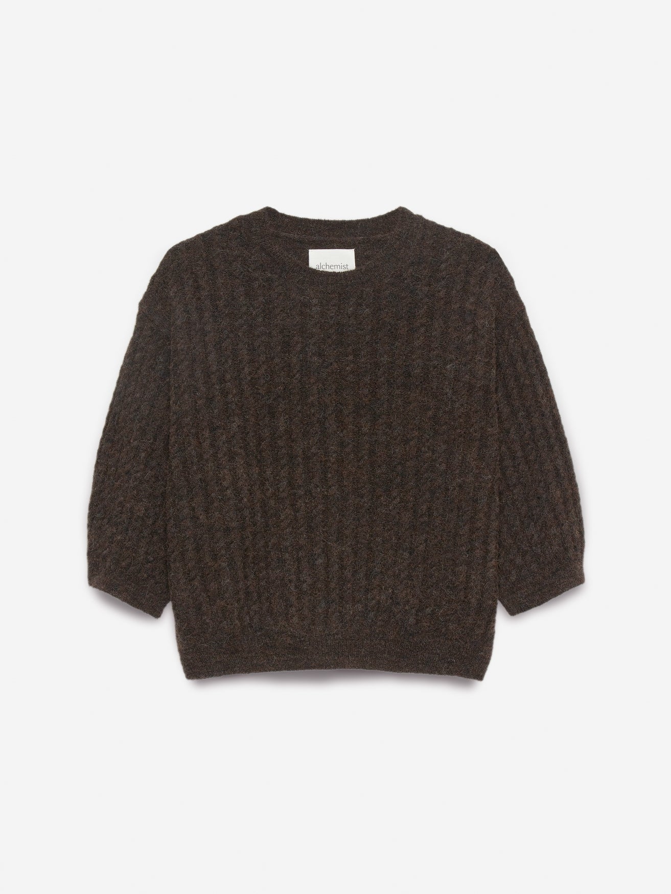 Boxy kabeltrui met halflange mouw en een ronde halslijn, gebreid in een zachte, volumineuze structuur. Het korte, rechte model geeft deze knit een eigentijdse uitstraling, terwijl de rijke mix van baby alpaca en zuivere scheerwol zorgt voor warmte en zachtheid.... Een modern en comfortabel item met een klassieke twist.